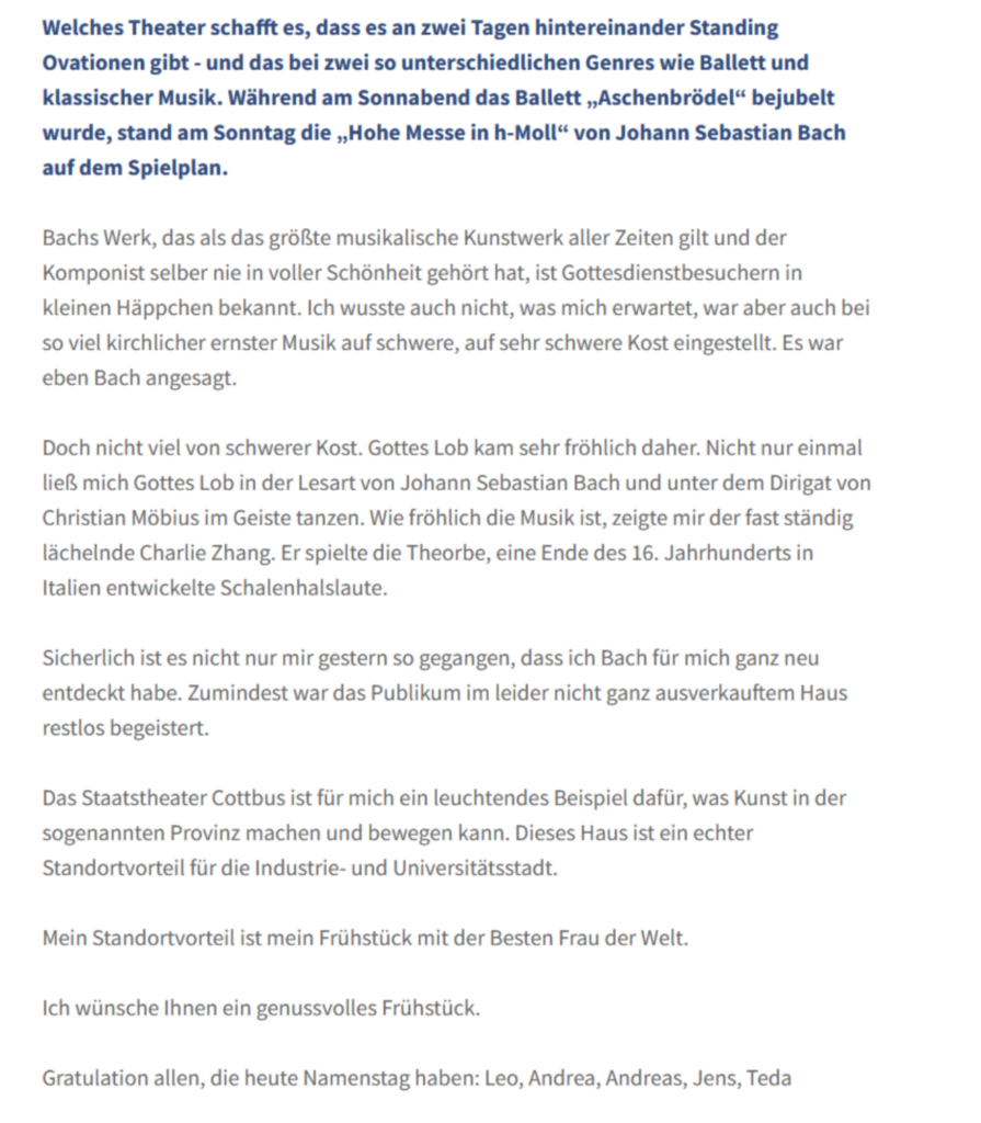 Eine gelungene Veranstaltung! Die Cottbuser haben sich „voll ins Zeug gelegt“. Alle aufgetragenen Speisen und Getränke kamen gut an – einfach lecker! Angeregte Unterhaltungen nicht nur über Musik und das bevorstehende Konzert. Ganz herzlichen Dank!